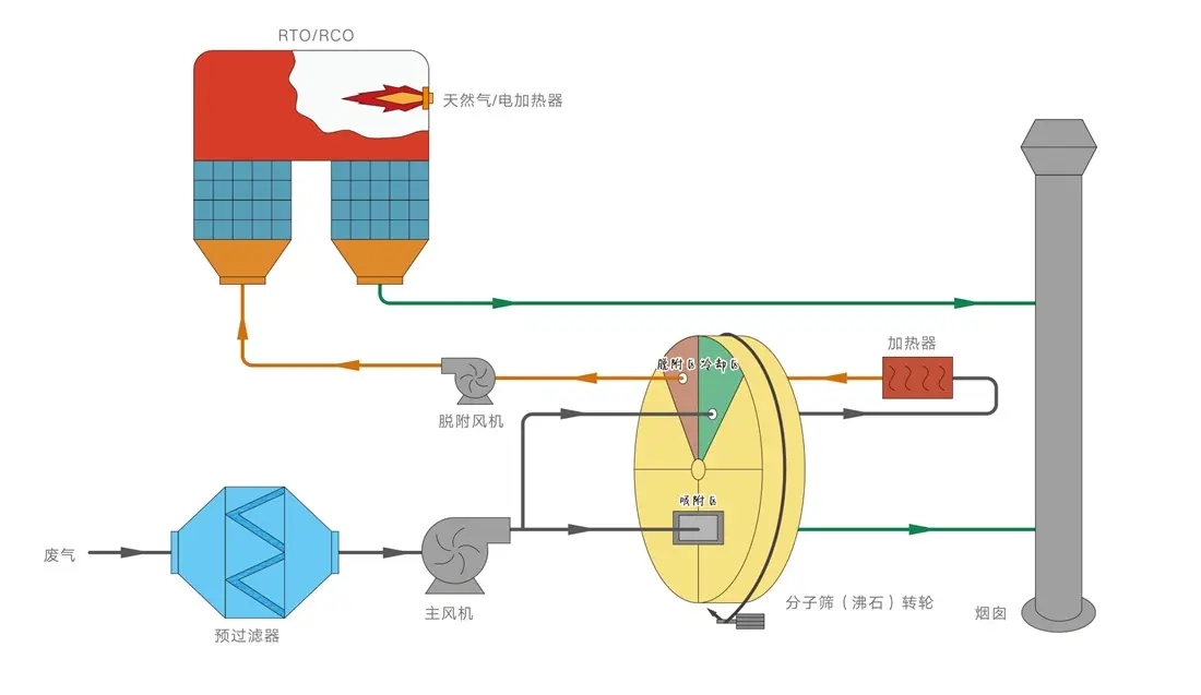 RTO把有機(jī)廢氣加熱到760攝氏度以上,使廢氣中的VOCs在氧化分解成二氧化碳和水。氧化產(chǎn)生的高溫氣體流經(jīng)陶瓷蓄熱體,使陶瓷體升溫而“蓄熱”,此“蓄熱”用于預(yù)熱后續(xù)進(jìn)入的有機(jī)廢氣,從而節(jié)省廢氣升溫的燃料消耗。陶瓷蓄熱體應(yīng)分成三個(gè)(含三個(gè))以上的區(qū)或室,每個(gè)蓄熱室依次經(jīng)歷蓄熱-放熱-清掃等程序,周而復(fù)始,連續(xù)工作。蓄熱室“放熱”后應(yīng)立即引入部分已處理合格的潔凈排氣對(duì)該蓄熱室進(jìn)行清掃(以保證VOC去除率在99%以上),只有待清掃完成后才能進(jìn)入“蓄熱”程序。RTO蓄熱式焚燒廢氣處理設(shè)備,是目前最為經(jīng)濟(jì)可靠的達(dá)到50mg/m3嚴(yán)格的排放標(biāo)準(zhǔn)的VOCs治理技術(shù),得到了廣泛的應(yīng)用。