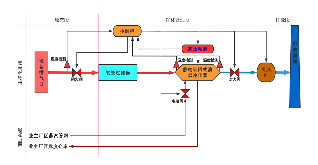 化纖車間作業(yè)廢氣,由設(shè)備排氣口接入廢氣收集管道,順不銹鋼管道進(jìn)入初效過濾器,先經(jīng)不銹鋼絲網(wǎng)初效過濾器濾除廢氣中的灰塵、纖維類顆粒物后,通過管道接入靜電吸附式油煙凈化器,經(jīng)凈化器內(nèi)高壓電場作用,油煙中油霧顆粒被電場陽極捕捉,順陽極滴落在集油盤中,由排油口排出至廢油收集桶。經(jīng)油煙凈化器凈化后的氣體,經(jīng)引風(fēng)機(jī)送入排放煙囪對(duì)空15米達(dá)標(biāo)排放。