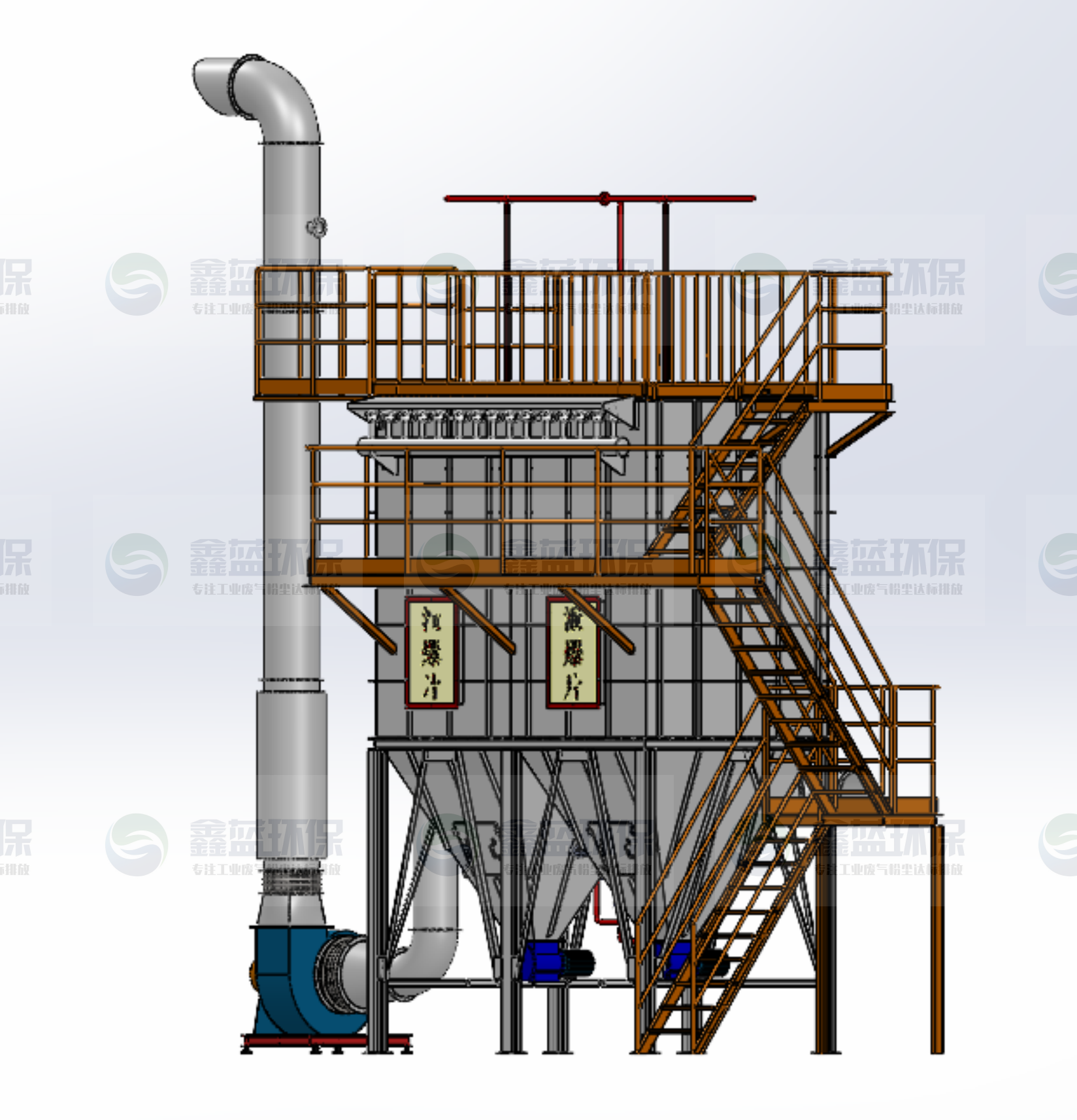 布袋除塵器主要部件包括漏斗、箱體、氣囊板、濾布袋、反吹掃設(shè)備和排氣裝置等。