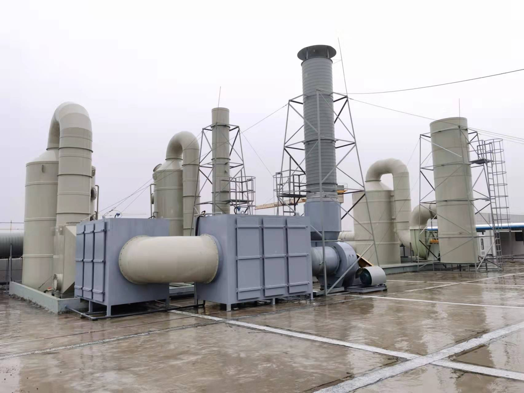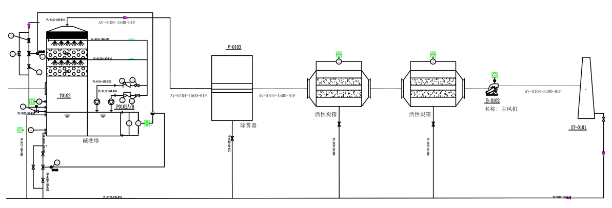 洗滌塔采用立式兩相逆向流填料塔。氣體從塔體下方進氣口沿切向進入凈化塔,在通風機的動力作用下,迅速充滿進氣段空間,然后均勻地通過均流段上升到填料吸收段。在填料的表面上,氣相中污染物被液相吸收。污染物隨吸收液流入下部貯液槽。未完全吸收的氣體繼續(xù)上升進入噴淋段。在噴淋段中吸收液從均布的噴嘴高速噴出,形成無數(shù)細小霧滴與氣體充分混合、接觸、繼續(xù)發(fā)生吸收作用。塔體的上部是除霧段,氣體中所夾帶的吸收液霧滴在這里被清除下來,經(jīng)過處理后的潔凈空氣從凈化塔上端管道進入下一處理流程。