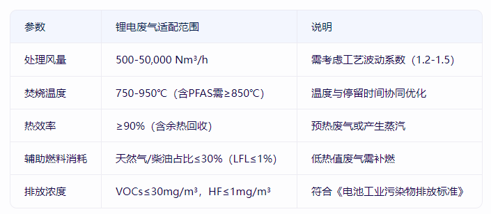 通過燃?xì)?/font>/燃油輔助燃燒,將廢氣加熱至750-950℃(根據(jù)成分調(diào)整),使有機(jī)物(如NMP、電解液)分解為CO?和H?O。