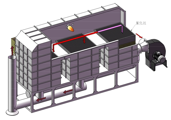 RCO的工作原理是:有機廢氣經過預處理后進入RCO設備,在催化組件的作用下,有機廢氣在較低的溫度下(通常為250℃~400℃)被氧化成無害的水和二氧化碳等物質。在此過程中,催化劑起到降低反應活化能的作用,使得有機廢氣能夠在較低的溫度下發(fā)生氧化反應。此外,RCO設備中的蓄熱體能夠有效地儲存和釋放熱量,從而實現(xiàn)熱能的回收利用,降低設備的運行成本。