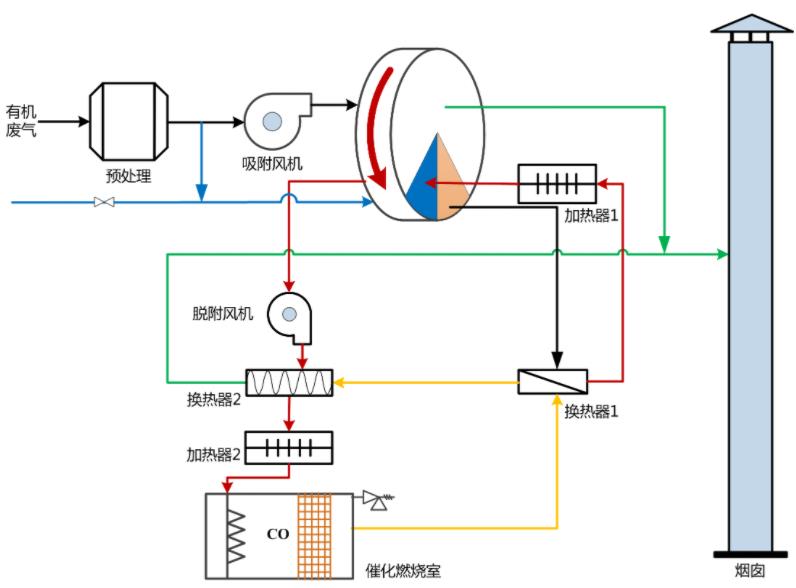 應(yīng)用:廢氣首先通過(guò)沸石轉(zhuǎn)輪進(jìn)行吸附凈化,吸附飽和后的沸石轉(zhuǎn)輪進(jìn)入再生區(qū),與高溫空氣接觸脫附有機(jī)物。脫附出的高濃度有機(jī)物進(jìn)入催化燃燒裝置進(jìn)行燃燒處理。