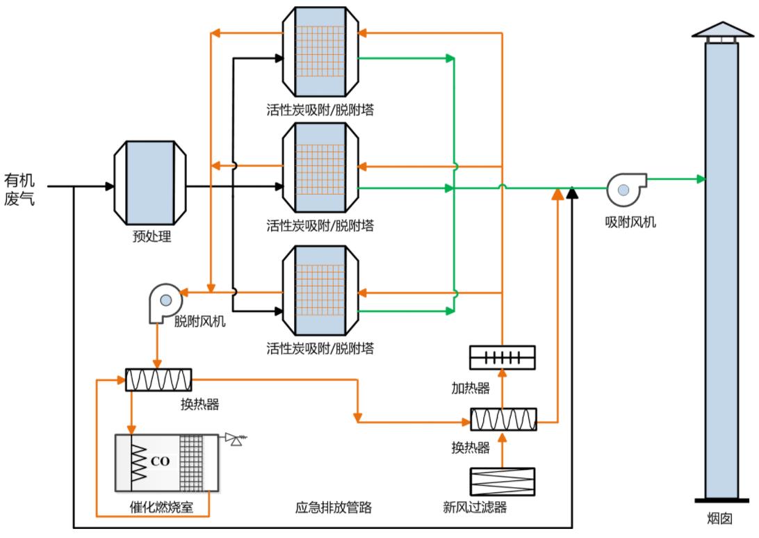 電線廢氣首先進入活性炭吸附箱進行吸附濃縮,活性炭吸附飽和后經(jīng)過加熱到80~120℃發(fā)生脫附。這些脫附下來的VOCs有機廢氣是原來廢氣的幾倍或是幾百倍,隨后進入催化燃燒室內(nèi)。廢氣在催化燃燒室內(nèi)200~400℃的溫度條件下發(fā)生無焰燃燒,廢氣被氧化分解成無毒無害的小分子化合物,例如:水和二氧化碳。催化燃燒反應(yīng)是一個放熱過程,熱氣被回收利用。這樣能滿足燃燒和脫附所需熱能,達到節(jié)能的目的,再生后的活性炭可用于下次吸附;在其中一個吸附床進行脫附時控制系統(tǒng)可自動打開另一個吸附床繼續(xù)進行有機廢氣的吸附工作,如此一來兩臺及多臺吸附床切換運行可實現(xiàn)大工作量的連續(xù)工作。