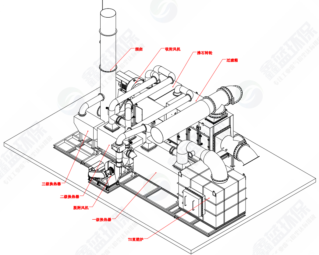企業(yè)在生產過程中排放的VOCs尾氣進入沸石轉輪吸附,吸附后的潔凈氣體經煙囪達標排放,沸石轉輪廢氣入口處設置過濾器,去除廢氣中的顆粒物。冷卻氣通過沸石轉輪冷卻區(qū)預加熱后再經過熱交換器升溫到所需的脫附溫度,進入沸石轉輪的脫附區(qū),脫除吸附在分子篩內的有機組分,脫附后的廢氣由脫附風機加壓進入TO爐進行直接燃燒。