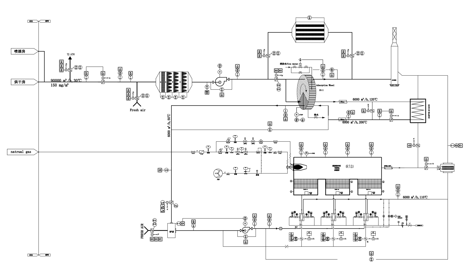 根據(jù)業(yè)主提供資料,本項目主要是噴漆房產(chǎn)生的廢氣,風(fēng)量為180000m3/h,結(jié)合噴涂行業(yè)特性,本項目屬于大風(fēng)量低濃度,適合運用預(yù)處理+沸石轉(zhuǎn)輪+RTO蓄熱焚燒的組合工藝,我司采用18000m3/h沸石轉(zhuǎn)輪濃縮,濃縮倍數(shù)控制在18倍,配套RTO采用10000m3/h的設(shè)計.