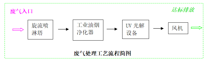 通過(guò)集氣罩對(duì)每個(gè)工位產(chǎn)生廢氣進(jìn)行點(diǎn)對(duì)點(diǎn)收集,收集后的廢氣經(jīng)過(guò)旋流噴淋塔去除部分有機(jī)物和顆粒物到工業(yè)油煙凈化器去除水霧油霧后進(jìn)入光催化氧化設(shè)備(內(nèi)含一個(gè)單元的活性炭纖維(活性炭)進(jìn)行深度催化氧化)進(jìn)行處理,處理最終潔凈的氣體由15米高煙囪排入到大氣中。旋流噴淋塔使用循環(huán)水中投加堿液可提高除硫和除氮氧化物的效果。