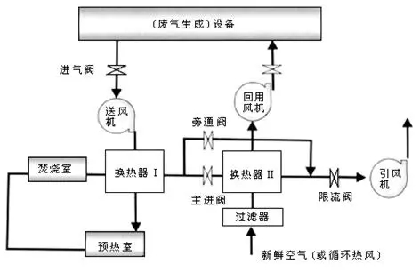 其工作過程為:用一臺(tái)高壓頭風(fēng)機(jī)將有機(jī)廢氣從烘干室內(nèi)抽出,經(jīng)過廢氣焚燒集中供熱裝置的內(nèi)置換熱器預(yù)熱后,到達(dá)燃燒室內(nèi),然后再通過燃燒機(jī)加熱,在高溫下(750℃左右)將有機(jī)廢氣進(jìn)行氧化分解,分解后的有機(jī)廢氣變成CO2和水。產(chǎn)生的高溫?zé)煔馔ㄟ^爐內(nèi)的換熱器和主煙氣管道排出,排出的煙氣對(duì)烘干室的循環(huán)風(fēng)進(jìn)行加熱,為烘干室提供所需的熱量。在系統(tǒng)末端設(shè)置新風(fēng)換熱裝置,將系統(tǒng)余熱進(jìn)行最后回收,將烘干室補(bǔ)充的新風(fēng)用煙氣加熱后送入烘干室。另外,在主煙氣管道上還設(shè)置有電動(dòng)調(diào)節(jié)閥,用于調(diào)節(jié)裝置出口的煙氣溫度,最終排放的煙氣溫度可以控制在160℃左右。