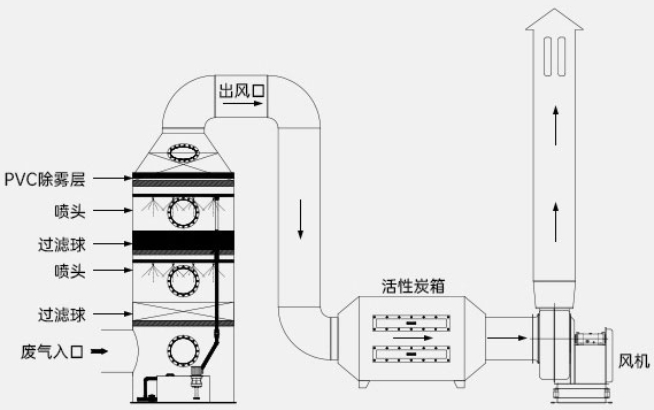 有機(jī)廢氣首先通過(guò)水噴淋塔進(jìn)行洗浴凈化,去除部分可溶性氣體和顆粒物。