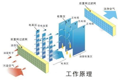 雙區(qū)雙壓板式油煙凈化器,由中壓陰極電離區(qū)及高壓陰極吸附區(qū)共同組成。含油霧廢氣先進(jìn)入中壓陰極電離區(qū),由陰極鎢絲上密布的極細(xì)微尖刺向陽(yáng)極極板間不斷發(fā)射大量游離態(tài)電子,電子在油霧進(jìn)入通道后,附集于油霧顆粒上使油霧顆粒荷電并呈負(fù)極性。在吸附區(qū),陰極板及陽(yáng)極板間因高壓靜電的施加形成靜電電暈電場(chǎng),陰極發(fā)射的電子急速由陰極向陽(yáng)極運(yùn)動(dòng)。當(dāng)荷電后的油霧顆粒隨氣流進(jìn)入高壓吸附區(qū),在靜電電暈電場(chǎng)作用下,荷負(fù)電的油霧顆粒開(kāi)始加速向陽(yáng)極方向運(yùn)動(dòng),在接觸到陽(yáng)極板后,油霧顆粒上附集的電子被陽(yáng)極板捕捉中和抵消,油霧顆粒在自身表面張力及附著粘性的特性下附著在陽(yáng)極板上,當(dāng)陽(yáng)極板上油霧顆粒越來(lái)越多時(shí),油霧顆粒不斷匯集凝聚,形成大顆粒的油滴順陽(yáng)極板滴落入凈化器下方設(shè)置的集油盤(pán)中,當(dāng)集油盤(pán)中油滴達(dá)到一定量時(shí),形成油液從集油盤(pán)底部的排油口經(jīng)球閥向外排出。含油霧廢氣經(jīng)過(guò)中壓電離電子附集→高壓靜電電暈電場(chǎng)吸附后,油霧被完全從廢氣中去除,凈化后的氣體由吸附區(qū)后端排出凈化設(shè)備。